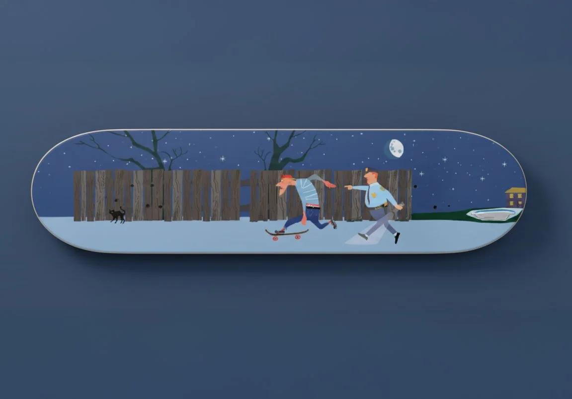 A cop chasing skater a playful mid-century flat style, inspired by 1950s children’s books. The shapes are bold and simplified, with clean lines and minimal shading, echoing the print techniques of the era. The color palette is muted yet punchy, leaning on retro tones like mustard yellow, faded teal, and warm red. The exaggerated, almost cartoonish movement gives the piece a sense of humor and whimsy, as if the runaway keyboard has taken on a life of its own. It feels nostalgic and lighthearted, capturing the charm of vintage storybook art while bringing a quirky modern twist.