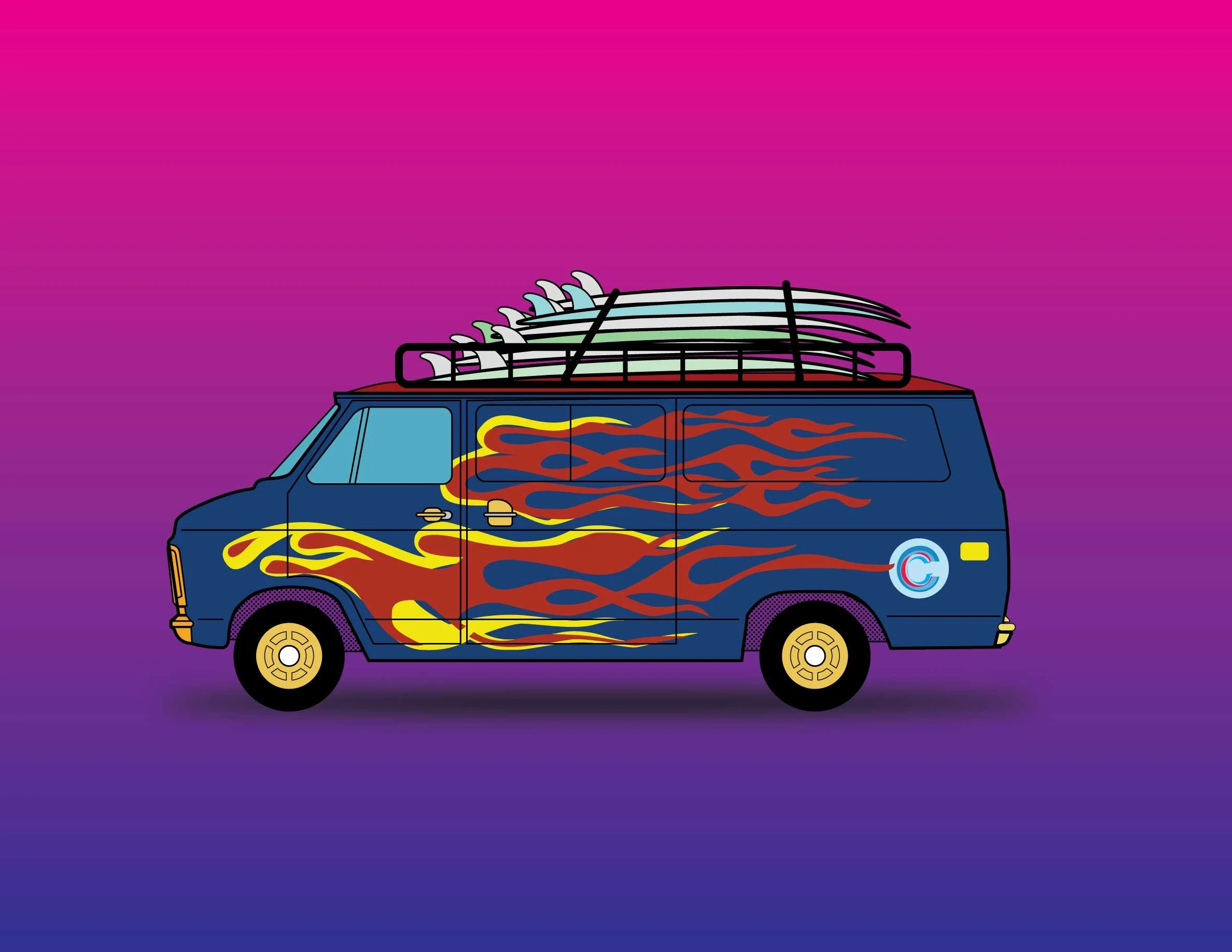 This illustration captures two icons of the road in a flat, mid-century–inspired style: a sleek 1972 Ferrari Dino and a classic 70s van stacked high with surfboards. The bold lines, simplified forms, and retro color palette celebrate the contrast between luxury performance and laid-back surf culture. It’s a playful snapshot of an era where cars weren’t just transportation.