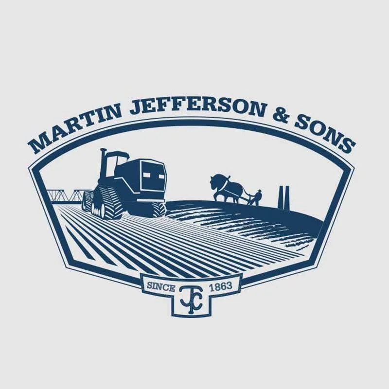 The Martin Jefferson & Sons logo tells the story of a fifth-generation farming legacy. Framed in a classic shield shape, it balances past and present—on one side, a modern tractor working clean rows, and on the other, a farmer with a horse-drawn plow. Subtle landmarks in the background ground the design in place, while the “MJ” brand and “Since 1863” reinforce heritage. A simple two-tone palette keeps the mark timeless and strong.