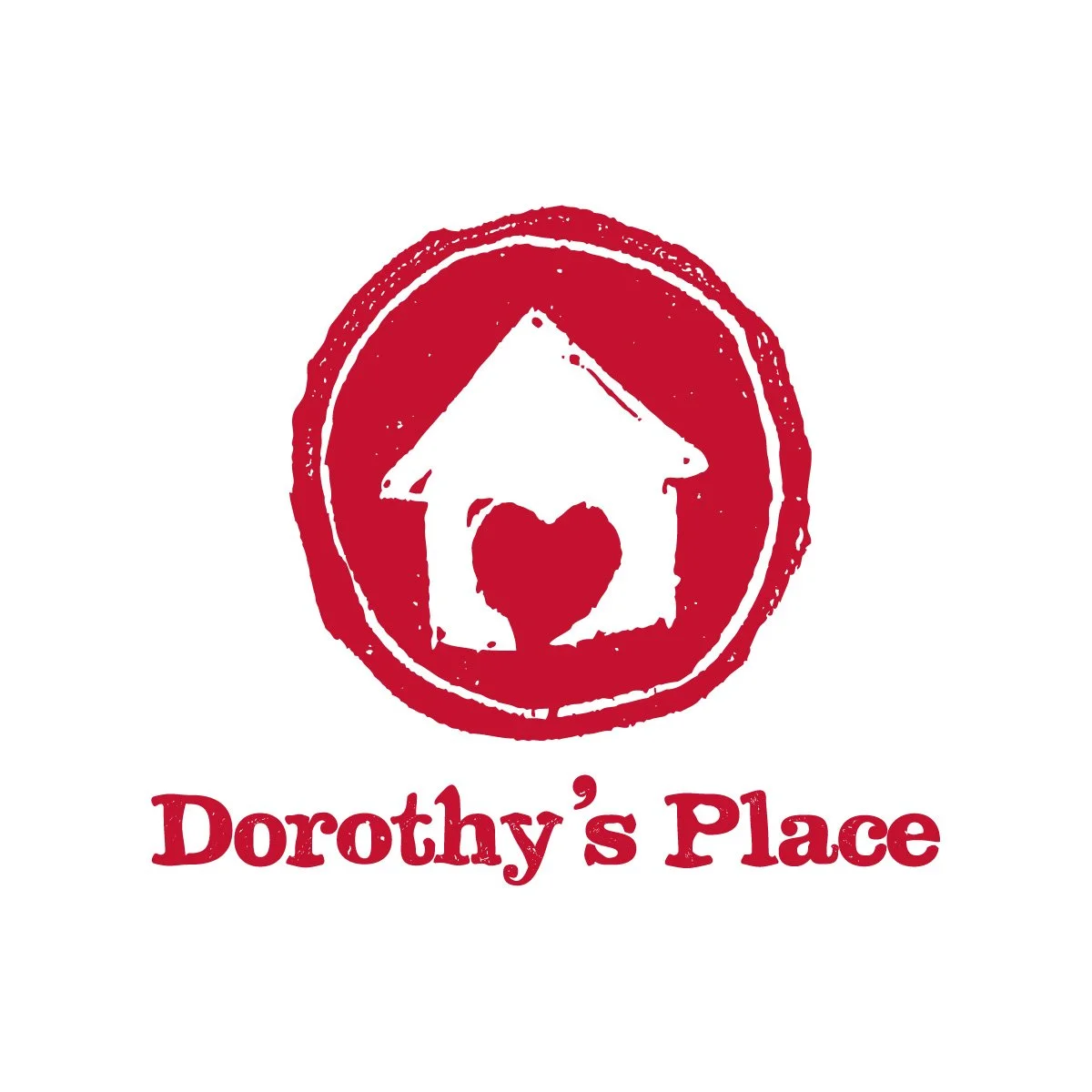 The logo for Dorothy’s Place, a local soup kitchen, combines simplicity with heart. A rustic, hand-stamped red circle frames a white house silhouette, with a heart in place of the door, symbolizing that everyone who walks through is valued and welcome. The distressed font ties it all together, giving the design an authentic, grassroots feel that reflects the organization’s mission of compassion and respect for every individual.